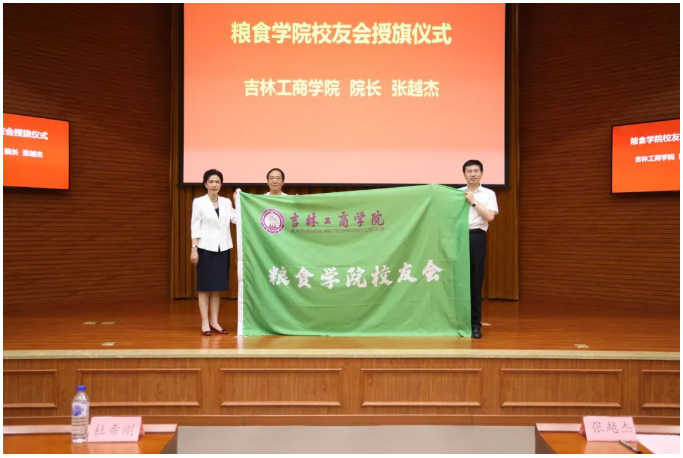 張?jiān)浇転榧Z食學(xué)院校友會(huì)授旗,吉林省和農(nóng)牧業(yè)集團(tuán)董事長(zhǎng)方彥明先生。