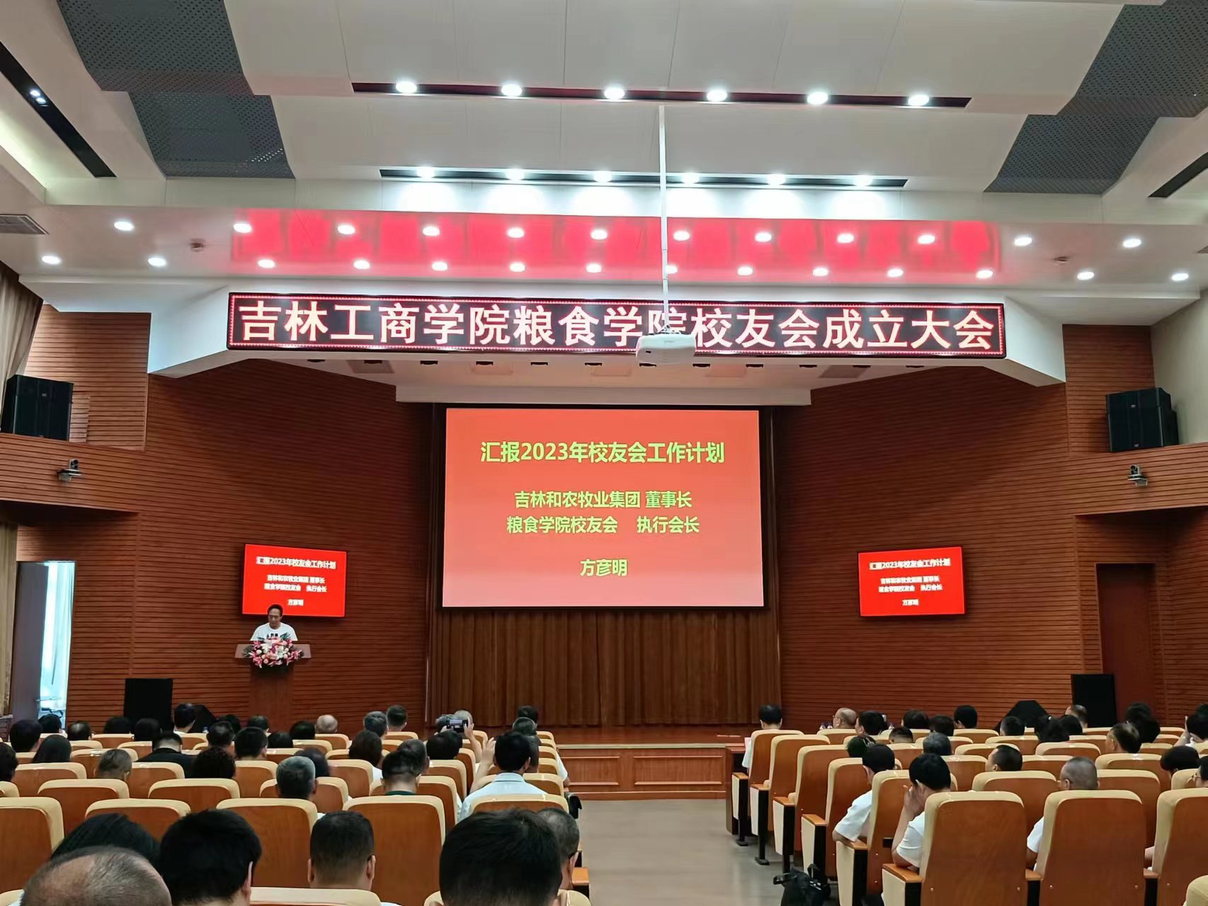 糧食學(xué)院校友會(huì)執(zhí)行會(huì)長(zhǎng)、糧食工程專(zhuān)業(yè)8104班校友、吉林省和農(nóng)牧業(yè)集團(tuán)董事長(zhǎng)方彥明先生向大會(huì)匯報(bào)糧食學(xué)院校友會(huì)2023年工作計(jì)劃。